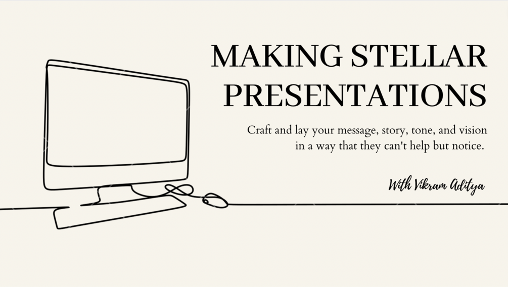 Everything you do in life is a presentation. Over the last ten years, I've 10xed my career by simply focusing on how I present everything I do. For the last four years, I started taking sessions on making presentations in closed groups. This is an attempt at opening it up to the broader internet.